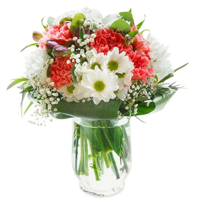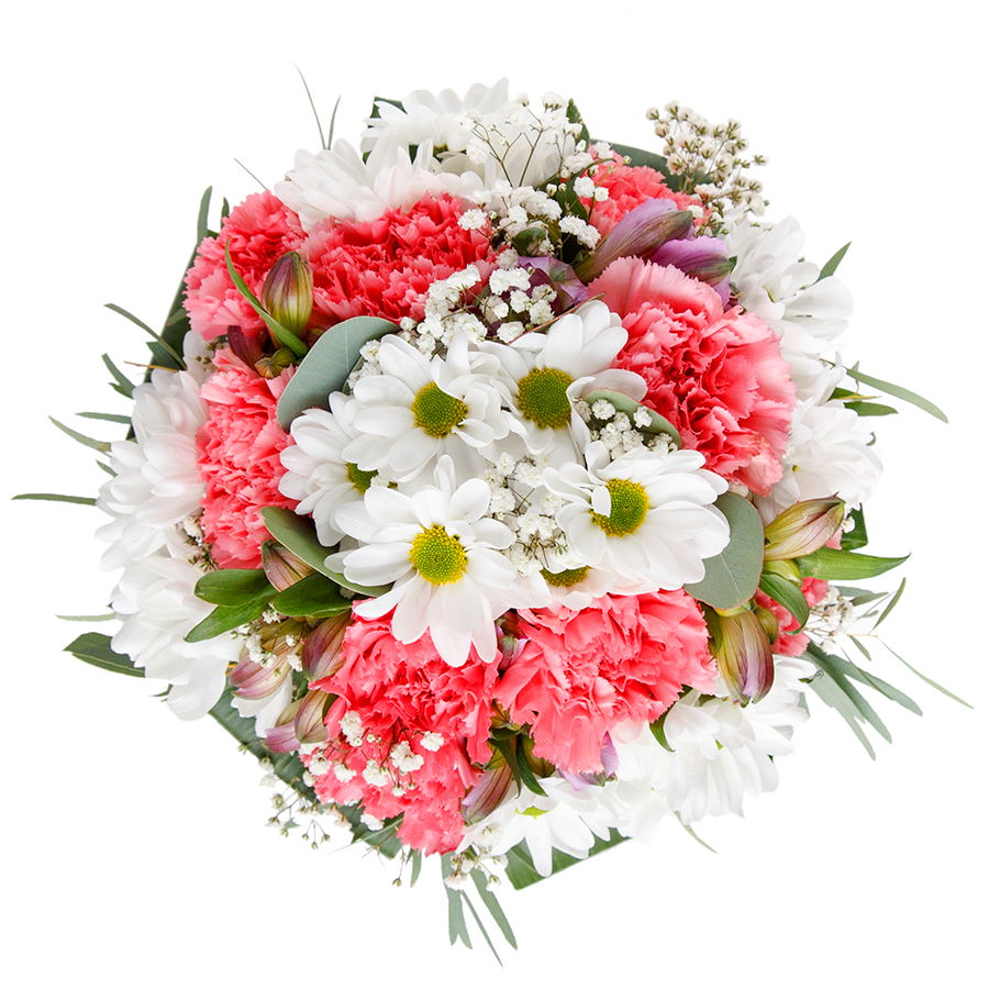 Our graceful floral bouquet is the perfect way to express your sentiments. Featuring snow-white chrysanthemums, soft gypsophila, and charming light pink carnations, all elegantly arranged with aspidistra leaves.